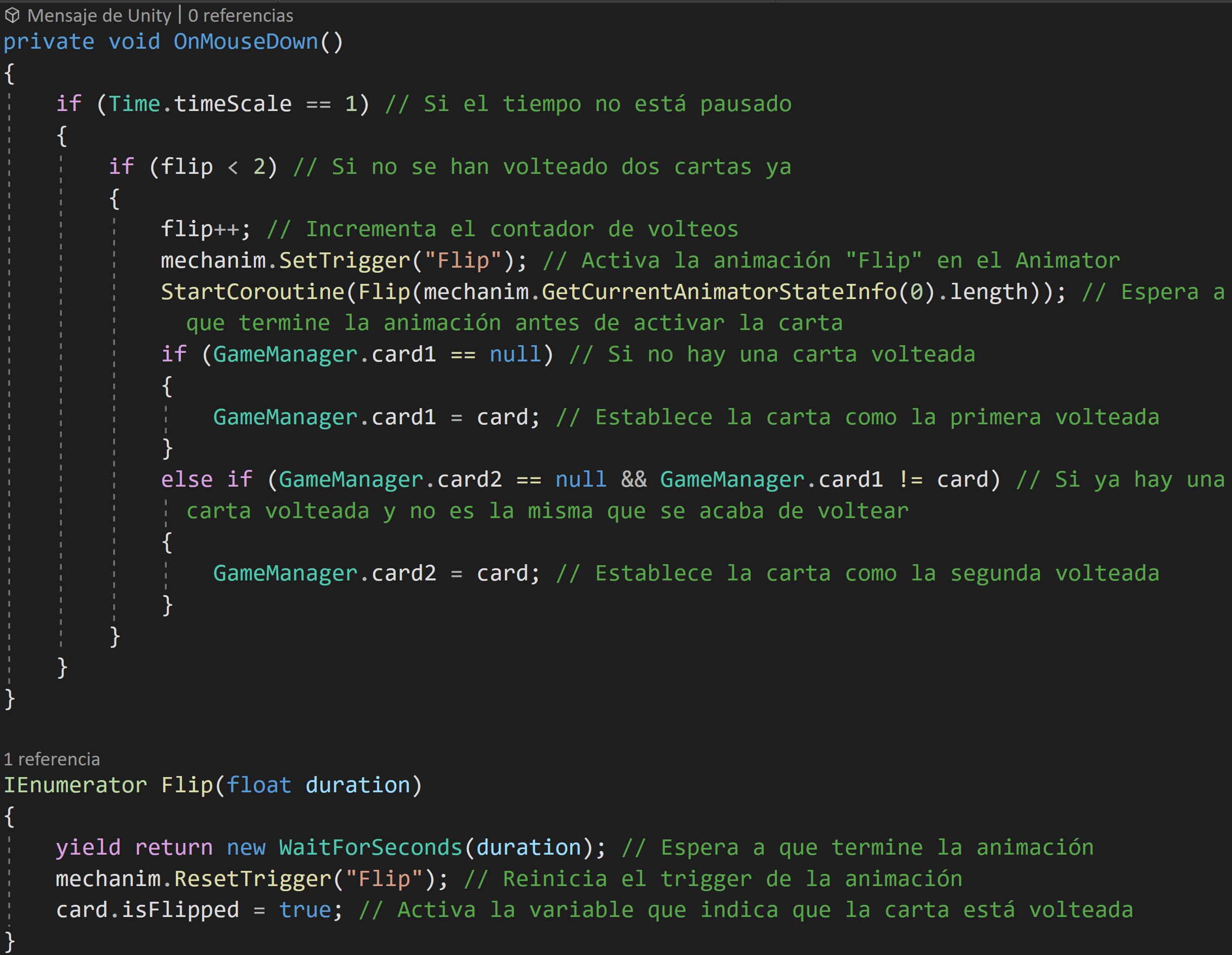 Si hace click en la carta, el tiempo no está pausado y hay menos de 2 cartas volteadas, empieza la animación de volteo de la carta. Si no hay ninguna carta volteada, se mete en la variable card1. Si hay una carta volteada y no hay una segunda carta volteada, se mete en card2. En el IEnumerator, se espera a que se dé la vuelta por completo para resetear el trigger y asignarle el booleano de que está dada la vuelta a verdadero.